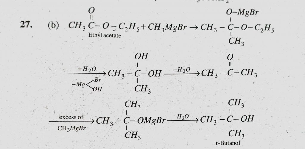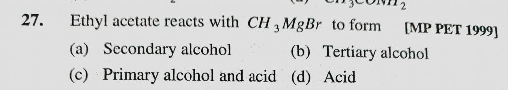 Ethyl acetate reacts with CH3MgBr to form (a) Secondary alcohol (b) Tertiary alcohol (c) Primary alcohol and acid (d) Acid Ethyl acetate reacts with CH3MgBr to form (a) Secondary alcohol (b) Tertiary alcohol (c) Primary alcohol and acid (d) Acid February 13, 2021 Category: Uncategorised (JEE Advanced Physics by BM Sharma + GMP Solutions) , Facebook Messenger WhatsApp Share this:TwitterFacebook Related