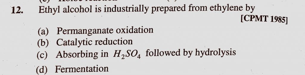 Ethyl alcohol is industrially prepared from ethylene by (a) Paramanganate oxidation (b) Catalytic reduction (c) Absorbing in H2SO4 followed by hydrolysis (d) Fermentation Ethyl alcohol is industrially prepared from ethylene by (a) Paramanganate oxidation (b) Catalytic reduction (c) Absorbing in H2SO4 followed by hydrolysis (d) Fermentation February 10, 2021 Category: Uncategorised (JEE Advanced Physics by BM Sharma + GMP Solutions) , Facebook Messenger WhatsApp Share this:TwitterFacebook Related