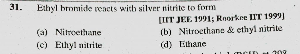 Ethyl bromide reacts with silver nitrate to form (a) Nitroethane (b) Nitroethane and ethyl nitrite (c) Ethyl nitrite (d) Ethane Ethyl bromide reacts with silver nitrate to form (a) Nitroethane (b) Nitroethane and ethyl nitrite (c) Ethyl nitrite (d) Ethane February 9, 2021 Category: Uncategorised (JEE Advanced Physics by BM Sharma + GMP Solutions) , Facebook Messenger WhatsApp Share this:TwitterFacebook Related