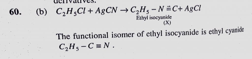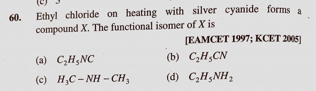 Ethyl chloride on heating with silver cyanide forms a compound X. The functional isomer of X is (a) C2H5NC (b) C2H5CN (c) H3C – NH – CH3 (d) C2H5NH2 Ethyl chloride on heating with silver cyanide forms a compound X. The functional isomer of X is (a) C2H5NC (b) C2H5CN (c) H3C - NH - CH3 (d) C2H5NH2 February 8, 2021 Category: Uncategorised (JEE Advanced Physics by BM Sharma + GMP Solutions) , Facebook Messenger WhatsApp Share this:TwitterFacebook Related
