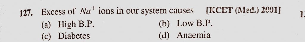 Excess of Na+ ions in our system causes (a) High B.P. (b) Low B.P. (c) Diabetes (d) Anaemia Excess of Na+ ions in our system causes (a) High B.P. (b) Low B.P. (c) Diabetes (d) Anaemia November 15, 2020 Category: Uncategorised (JEE Advanced Physics by BM Sharma + GMP Solutions) , Facebook Messenger WhatsApp Share this:TwitterFacebook Related