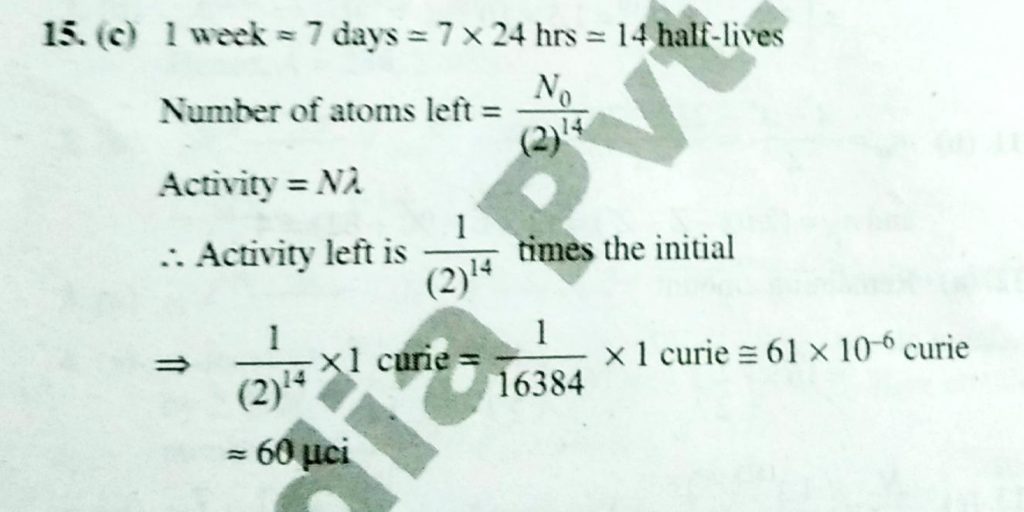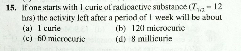 If one starts with 1 curie of radioactive substance ( T 1/2 = 12 hrs ) the activity left after a period of 1 week will be about If one starts with 1 curie of radioactive substance ( T 1/2 = 12 hrs ) the activity left after a period of 1 week will be about September 14, 2020 Category: Uncategorised (JEE Advanced Physics by BM Sharma + GMP Solutions) , Facebook Messenger WhatsApp Share this:TwitterFacebook Related