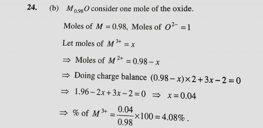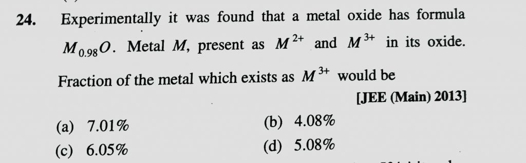 Experimentally it was found that a metal oxide has formula M0.98O. Metal M, present as M^2+ and M^3+ in its oxide. Fraction of the metal which exists as M^3+ would be Experimentally it was found that a metal oxide has formula M0.98O. Metal M present as M^2+ and M^3+ in its oxide. Fraction of the metal which exists as M^3+ would be February 9, 2021 Category: Uncategorised (JEE Advanced Physics by BM Sharma + GMP Solutions) , Facebook Messenger WhatsApp Share this:TwitterFacebook Related