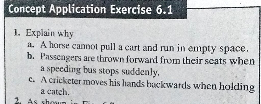 Explain why a. A horse cannot pull a cart and run in empty space. b. Passengers are thrown forward from their seats when a speeding bus stops suddenly. c. A cricketer moves his hands backwards Explain why a. A horse cannot pull a cart and run in empty space. b. Passengers are thrown forward from their seats when a speeding bus stops suddenly. c. A cricketer moves his hands backwards September 25, 2020 Category: Uncategorised (JEE Advanced Physics by BM Sharma + GMP Solutions) , Facebook Messenger WhatsApp Share this:TwitterFacebook Related
