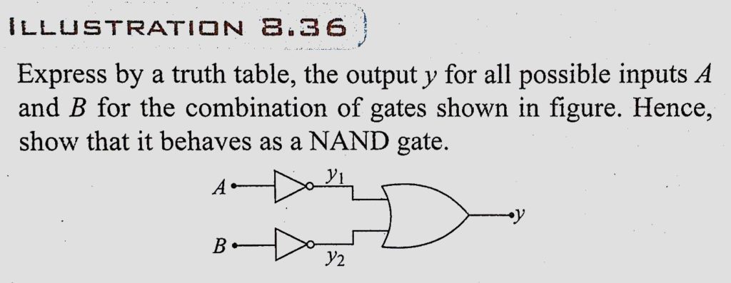 Express by a truth table, the output y for all possible inputs A and B for the combination of gates shown in figure. Hence, show that it behaves as a NAND gate. Express by a truth table show that it behaves as a NAND gate. the output y for all possible inputs A and B for the combination of gates shown in figure. Hence September 14, 2020 Category: Uncategorised (JEE Advanced Physics by BM Sharma + GMP Solutions) , Facebook Messenger WhatsApp Share this:TwitterFacebook Related
