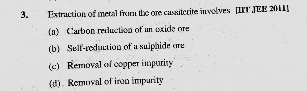 Extraction of metal from the ore cassiterite involves (a) Carbon reduction of an oxide ore (b) Self-reduction of a sulphide ore Extraction of metal from the ore cassiterite involves (a) Carbon reduction of an oxide ore (b) Self-reduction of a sulphide ore November 12, 2020 Category: Uncategorised (JEE Advanced Physics by BM Sharma + GMP Solutions) , Facebook Messenger WhatsApp Share this:TwitterFacebook Related