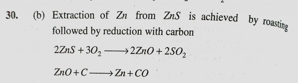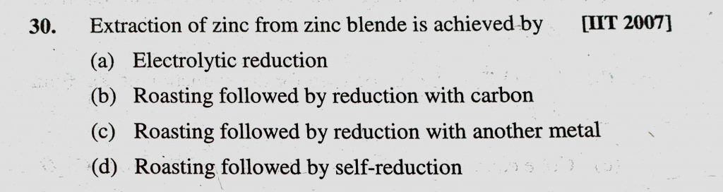 Extraction of zinc from zinc blende is achieved by (a) Electrolytic reduction (b) Roasting followed by reduction with carbon Extraction of zinc from zinc blende is achieved by (a) Electrolytic reduction (b) Roasting followed by reduction with carbon November 12, 2020 Category: Uncategorised (JEE Advanced Physics by BM Sharma + GMP Solutions) , Facebook Messenger WhatsApp Share this:TwitterFacebook Related