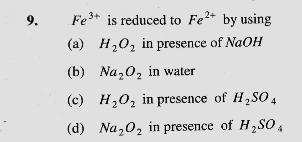 Fe 3+ is reduced to fe 2+ by using (a) H2O2 in presence of NaOH (c) H2O2 in presence of H2SO4 Fe 3+ is reduced to fe 2+ by using (a) H2O2 in presence of NaOH (c) H2O2 in presence of H2SO4 December 3, 2020 Category: Uncategorised (JEE Advanced Physics by BM Sharma + GMP Solutions) , Facebook Messenger WhatsApp Share this:TwitterFacebook Related