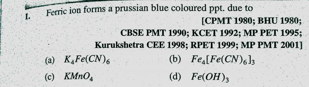 Ferric ion forms a prussian blue coloured ppt. due to (a) K4Fe(CN)6 (b) Fe4(Fe(CN)6)3 Ferric ion forms a prussian blue coloured ppt. due to (a) K4Fe(CN)6 (b) Fe4(Fe(CN)6)3 December 6, 2020 Category: Uncategorised (JEE Advanced Physics by BM Sharma + GMP Solutions) , Facebook Messenger WhatsApp Share this:TwitterFacebook Related