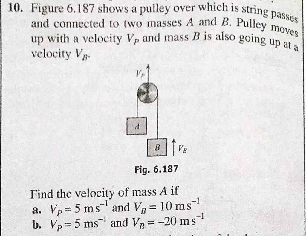 Figure 6.187 shows a pulley over which is string passes and connected to two masses A and B. Pulley moves up with a velocity Vp and mass B is also going up at a velocity Vb. Figure 6.187 shows a pulley over which is string passes and connected to two masses A and B. Pulley moves up with a velocity Vp and mass B is also going up at a velocity Vb. September 28, 2020 Category: Uncategorised (JEE Advanced Physics by BM Sharma + GMP Solutions) , Facebook Messenger WhatsApp Share this:TwitterFacebook Related