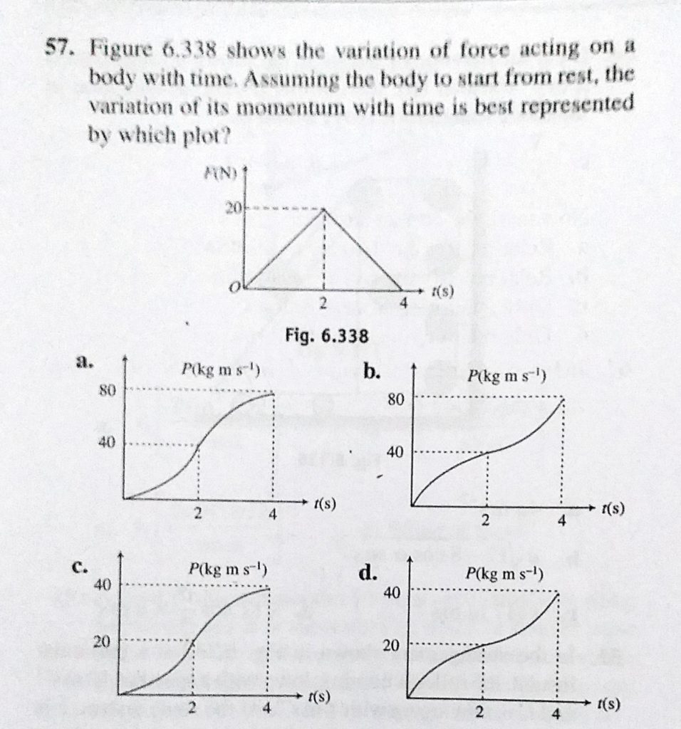 Figure 6.338 shows the variation of force action on a body with time. Assuming the body to start from rest, the variation of its momentum with time is best represented by which plot? Figure 6.338 shows the variation of force action on a body with time. Assuming the body to start from rest the variation of its momentum with time is best represented by which plot? September 29, 2020 Category: Uncategorised (JEE Advanced Physics by BM Sharma + GMP Solutions) , Facebook Messenger WhatsApp Share this:TwitterFacebook Related