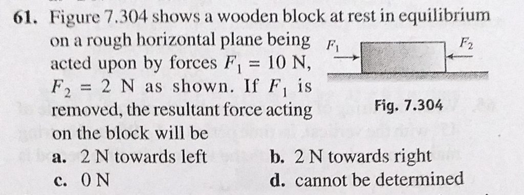 Figure 7.304 shows a wooden block at rest in equilibrium on a rough horizontal plane being acted upon by forces F1 = 10 N, F2 = 2 N as shown . If F1 is removed, the resultant force acting F2 = 2 N as shown . If F1 is removed Figure 7.304 shows a wooden block at rest in equilibrium on a rough horizontal plane being acted upon by forces F1 = 10 N the resultant force acting October 1, 2020 Category: Uncategorised (JEE Advanced Physics by BM Sharma + GMP Solutions) , Facebook Messenger WhatsApp Share this:TwitterFacebook Related