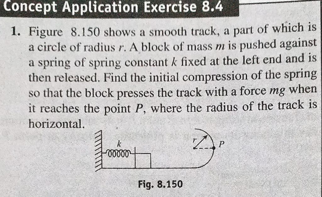 Figure 8.150 shows a smooth track, a part of which is a circle of radius r. A block of mass m is pushed against a spring of spring constant k fixed at the left end and is then released. Find the initial compression of the spring a part of which is a circle of radius r. A block of mass m is pushed against a spring of spring constant k fixed at the left end and is then released. Find the initial compression of the spring Figure 8.150 shows a smooth track October 3, 2020 Category: Uncategorised (JEE Advanced Physics by BM Sharma + GMP Solutions) , Facebook Messenger WhatsApp Share this:TwitterFacebook Related