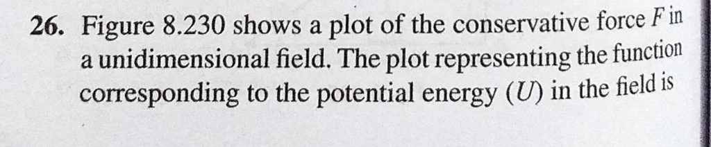 Figure 8.230 shows a plot of the conservative force F in a unidimensional field. The plot representing the function corresponding to the potential energy (U) in the field is Figure 8.230 shows a plot of the conservative force F in a unidimensional field. The plot representing the function corresponding to the potential energy (U) in the field is October 3, 2020 Category: Uncategorised (JEE Advanced Physics by BM Sharma + GMP Solutions) , Facebook Messenger WhatsApp Share this:TwitterFacebook Related
