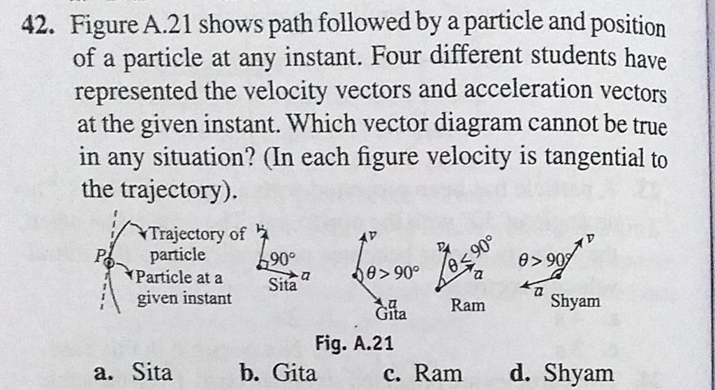 Figure A.21 shows path followed by a particle and position of a particle at any instant. Four different students have represented the velocity vectors and acceleration vectors at the given instant. Which vector diagram cannot be true A particle is thrown at time t = 0 with a velocity of 10 m/s at an angle 60 with the horizontal from a point on an inclined plane making an angle of 30 with the horizontal. The time when the velocity September 24, 2020 Category: Uncategorised (JEE Advanced Physics by BM Sharma + GMP Solutions) , Facebook Messenger WhatsApp Share this:TwitterFacebook Related