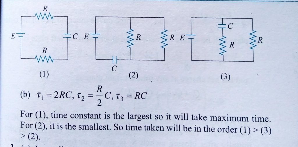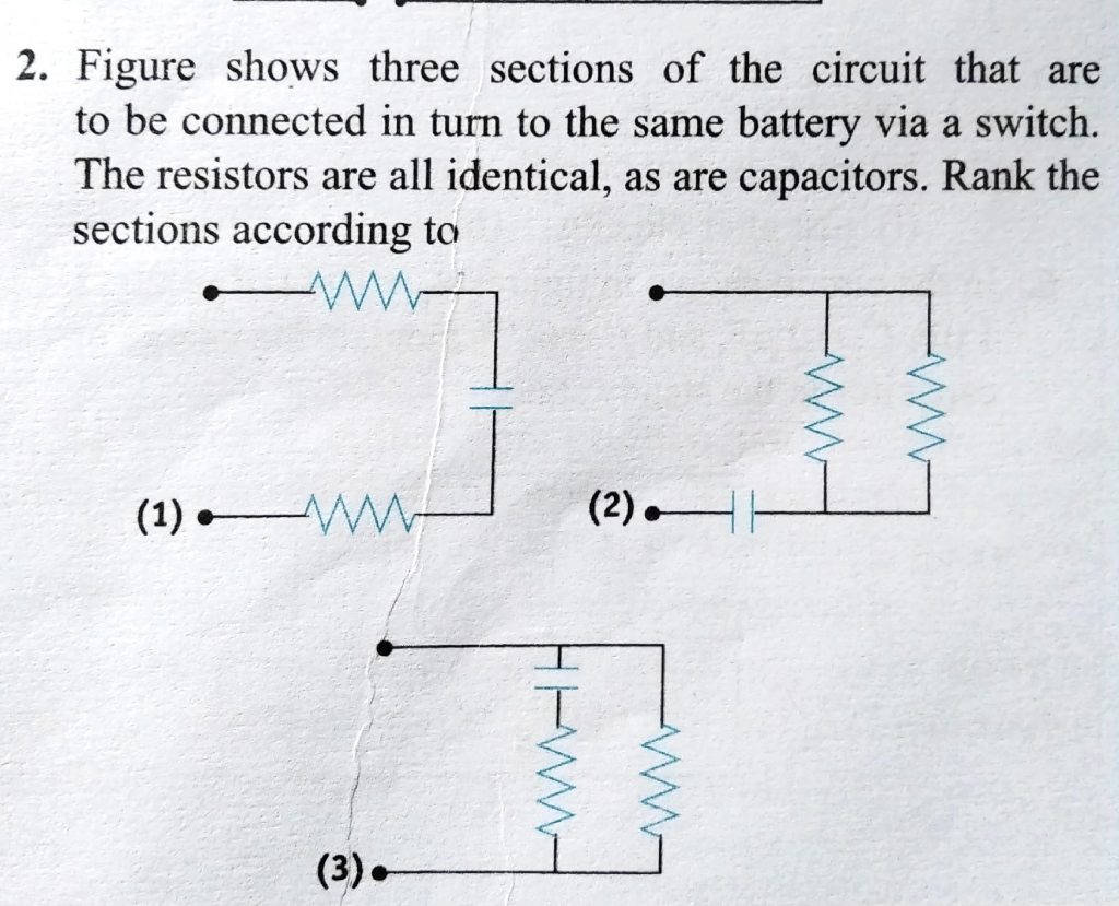 Figure Shown three sections of the circuit that are to be connecte in turn to the same battery via a switch. The resistors are all identical, as are capactiors. Rank the sections according to a. the final (equilibrium) charge on the capacitor……… b. the time required for the capacitor to reah 50% of its final charge, greatest first…….