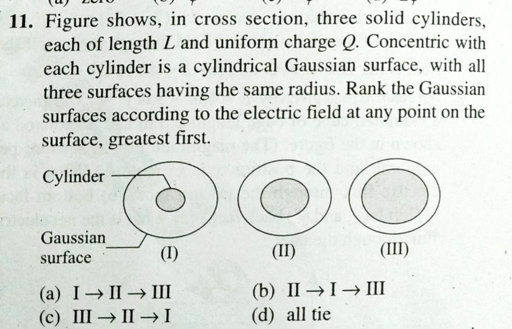 Figure showns. In cross section m three solid cylinders, each of length L and uniform charge Q. Concntric with each cylinder is a cylindrical Gaussion surface, with all three surfaces having the same radius. Rank the Gussion surface according to the electric field at any point on the suface, greatest first.