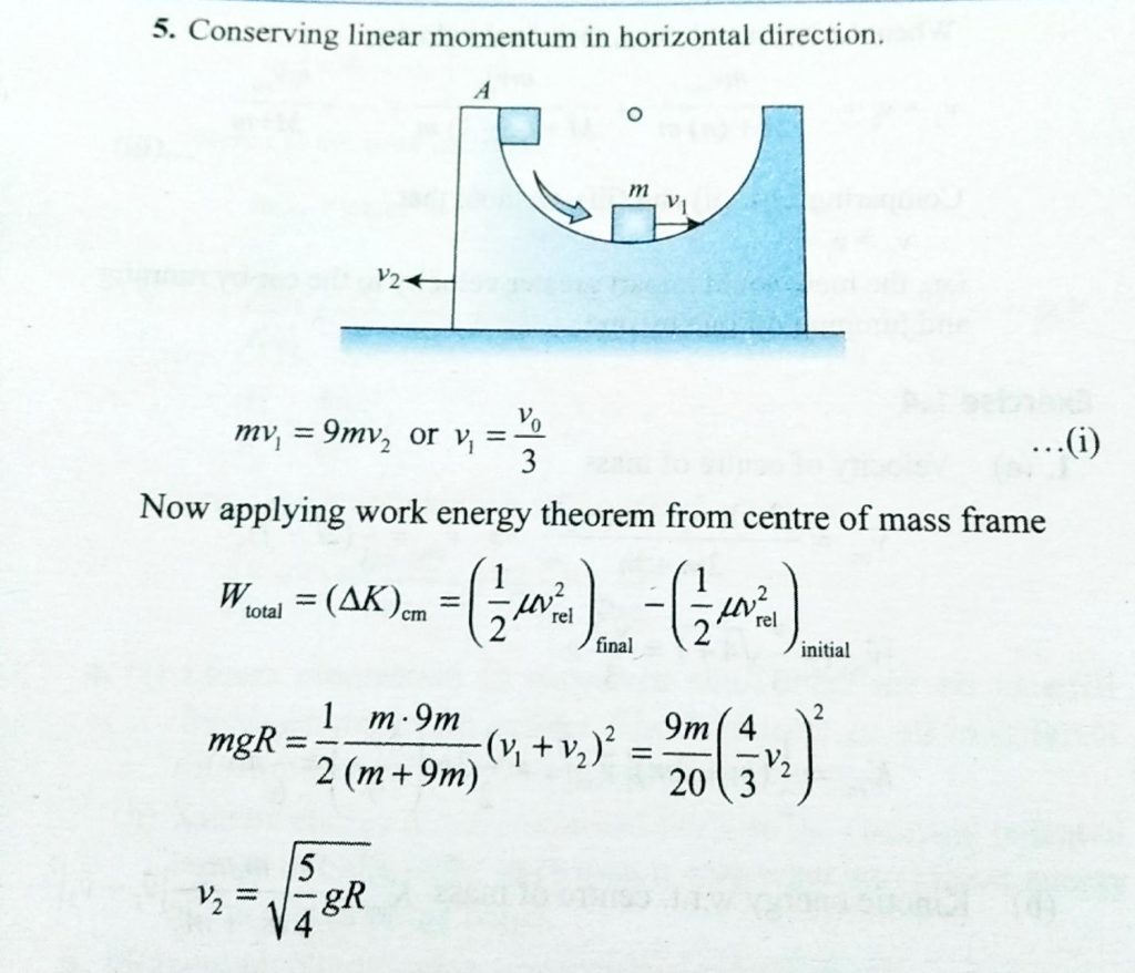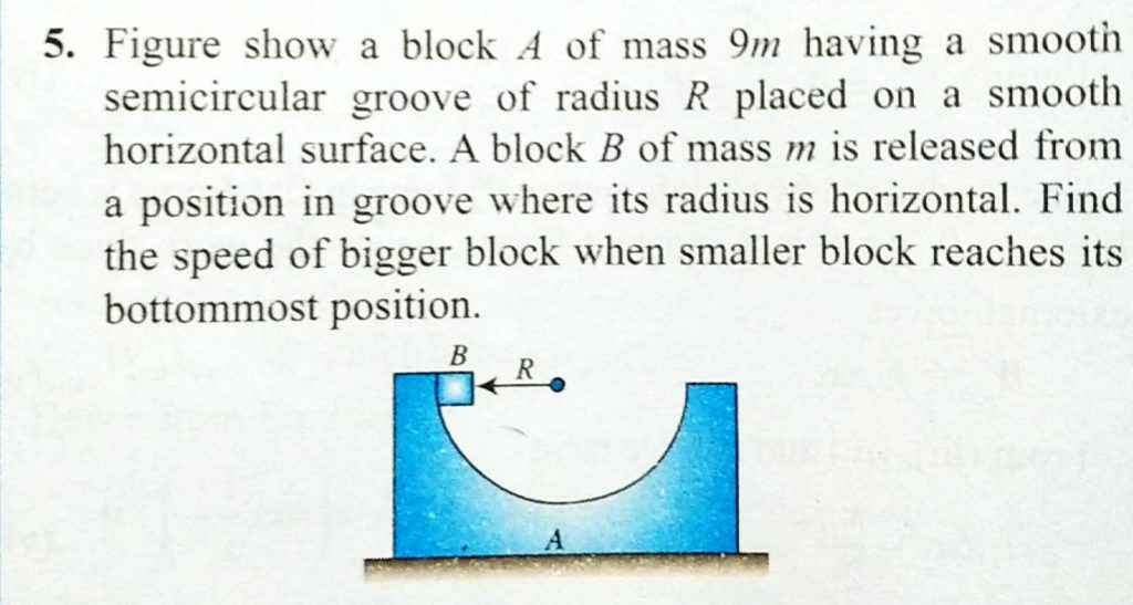 Figure shows a block A of mass 9 m having a smooth semicircular groove of radius a placed on a smooth horizontal surface. A block B of mass m is released from a position in groove where its radius is horizontal. Find the speed of the bigger block when the smaller block reaches its bottom most position.