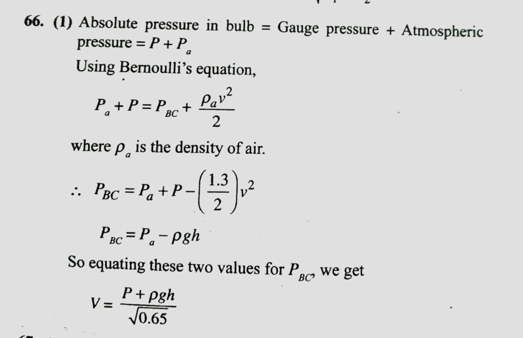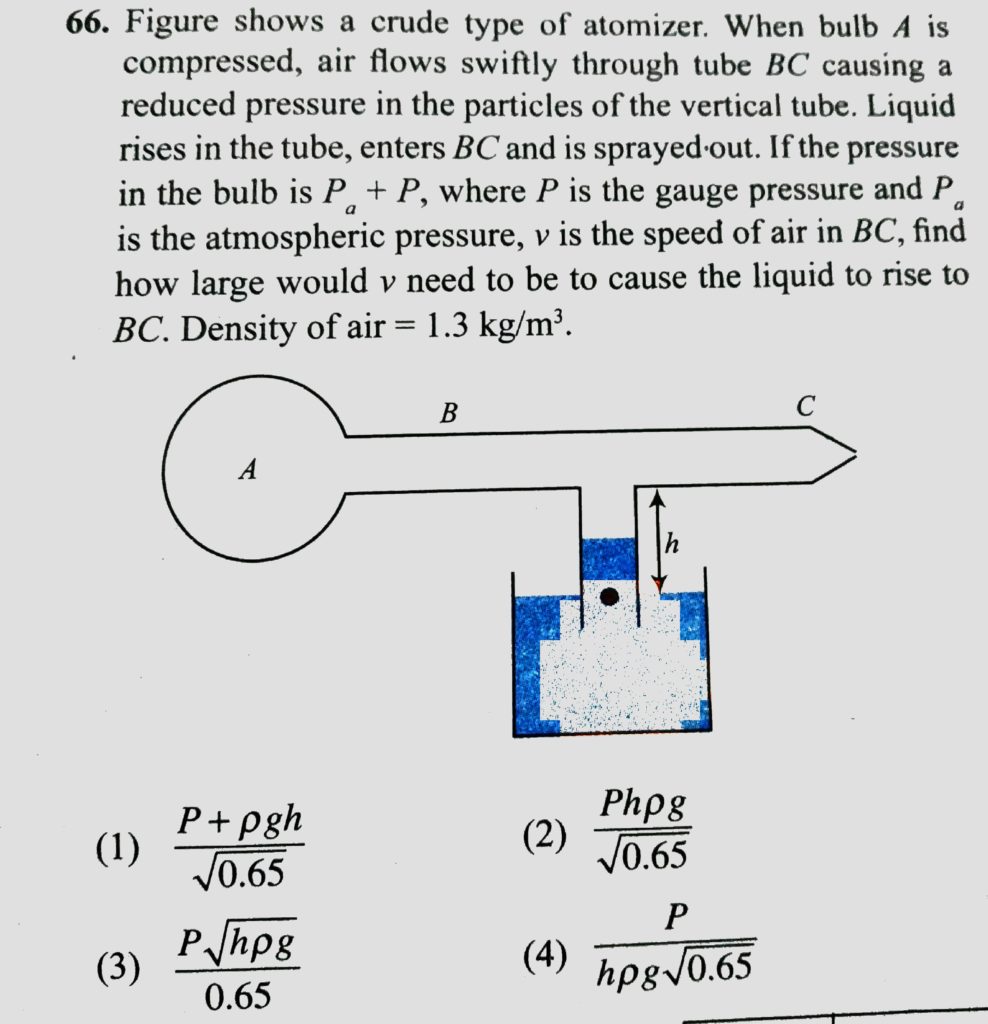 Figure shows a crude type of atomizer. is compressed, air flows swiftly through tube BC causing a reduced pressure in the particles of the vertical to Liquid rises in the tube, enters BC and is sprayed out. if the pressure in the bulb is Pa+P, where P is the gauge pressure and Pa is the atmospheric pressure, v is the speed of air in BC, find how large would v need to be to cause the liquid to rise to BC. Density of air = 1.3 kg/m^3.