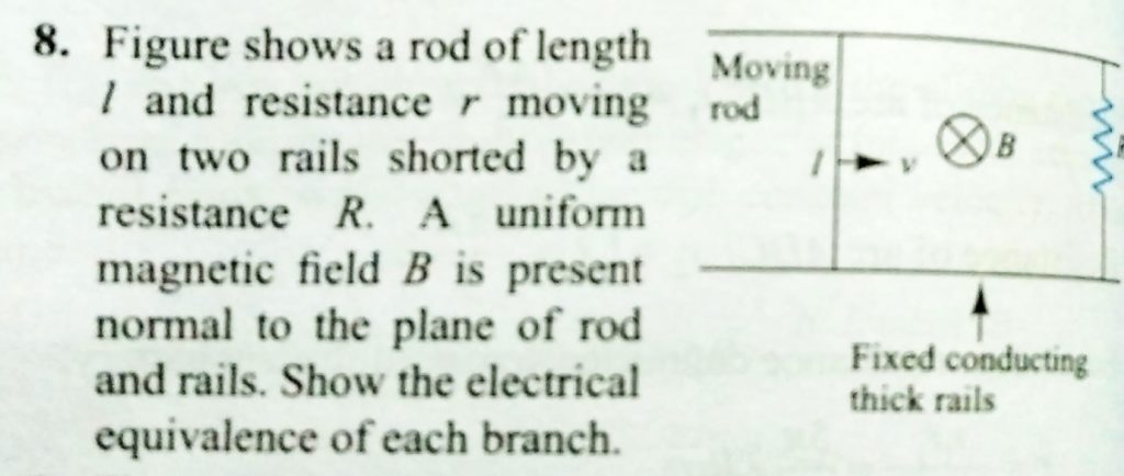 Figure shows a rod of length l and resistance r moving on two rails shorted by a resistance R. A uniform magnetic field B is present normal to the plane of rod and rails. Show the electrical equivalence of each branch. Figure shows a rectangular loop moving in a uniform magnetic field. Show the electrical equivalence of each branch. what is the net induced emf ? October 19, 2020 Category: Uncategorised (JEE Advanced Physics by BM Sharma + GMP Solutions) , Facebook Messenger WhatsApp Share this:TwitterFacebook Related