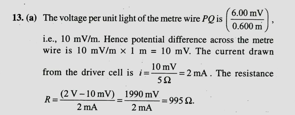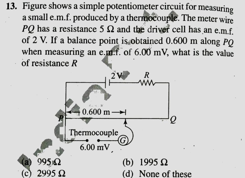 Figure shows a simple a potentiometer circuit for measuring a small emf produced by a thermocouple. The meter wire PQ has a resistance of 5Ω, and the driver cell has an emf of 2.00V. If a balance point is obtained 0.600 m along PQ when measuring an emf of 6.00 mV, what is the value of resistance R?