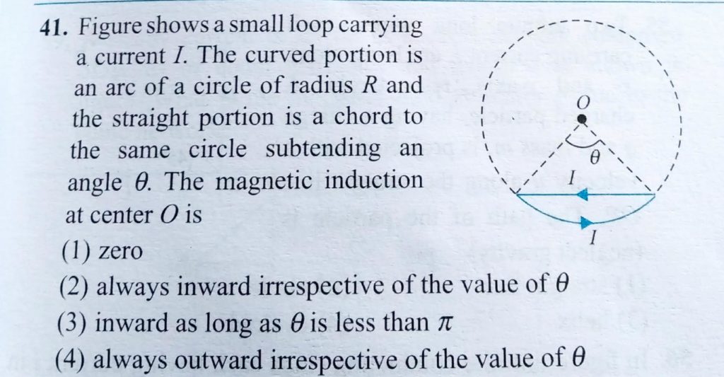 Figure. Shows a small loop carrying a current I. The curved portion is an arc of a circle of radius R and the straight portion is a chord to the same circle subtending an angle θ. The magnetic induction at centor O is carrying currents i1 and i2 are lying along x - and y - axes as shown in the x- y plane. Then Two infinite wires October 17, 2020 Category: Uncategorised (JEE Advanced Physics by BM Sharma + GMP Solutions) , Facebook Messenger WhatsApp Share this:TwitterFacebook Related