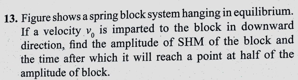 Figure shows a spring block system hanging in equilibrium. If a velocity v0 is imparted to the block in downward direction, find the amplitude of SHM of the block and the time Figure shows a spring block system hanging in equilibrium. If a velocity v0 is imparted to the block in downward direction find the amplitude of SHM of the block and the time October 30, 2020 Category: Uncategorised (JEE Advanced Physics by BM Sharma + GMP Solutions) , Facebook Messenger WhatsApp Share this:TwitterFacebook Related