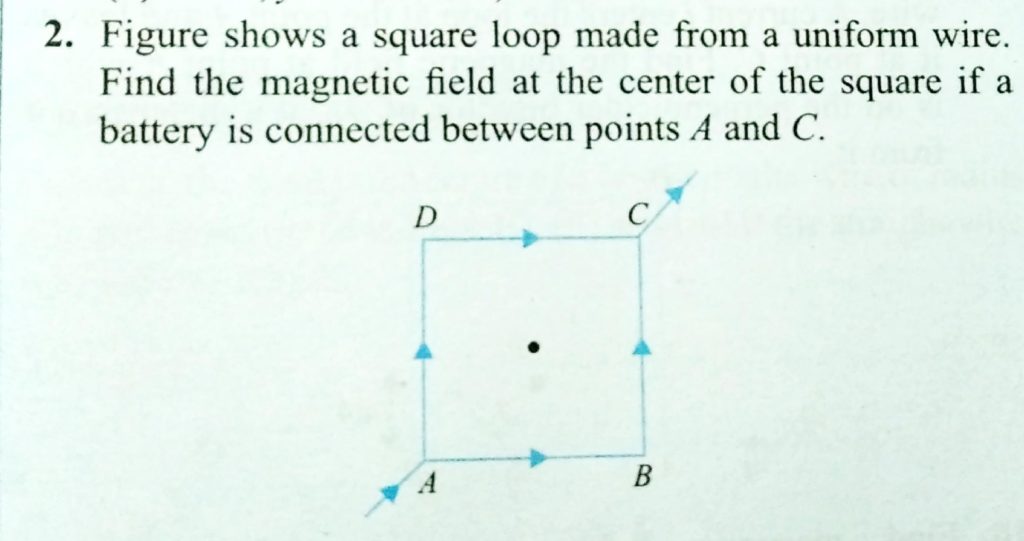 Figure shows a square loop made from a uniform wire. Find the magnetic field at the centre of the square if a battery is connected between points A and C. Figure shows a square loop made from a uniform wire. Find the magnetic field at the centre of the square if a battery is connected between points A and C. October 16, 2020 Category: Uncategorised (JEE Advanced Physics by BM Sharma + GMP Solutions) , Facebook Messenger WhatsApp Share this:TwitterFacebook Related