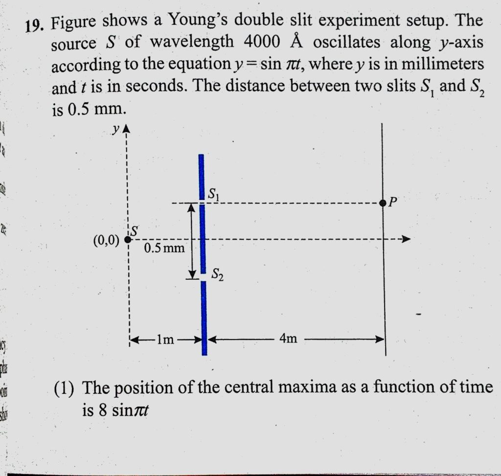 Figure shows a Young’s double slit experiment setup. The source S of wavelength 4000 A oscillates along y-axis according to the equation y = sin pie t, where y is in millimeters and Figure shows a Young's double slit experiment setup. The source S of wavelength 4000 A oscillates along y-axis according to the equation y = sin pie t where y is in millimeters and October 11, 2020 Category: Uncategorised (JEE Advanced Physics by BM Sharma + GMP Solutions) , Facebook Messenger WhatsApp Share this:TwitterFacebook Related