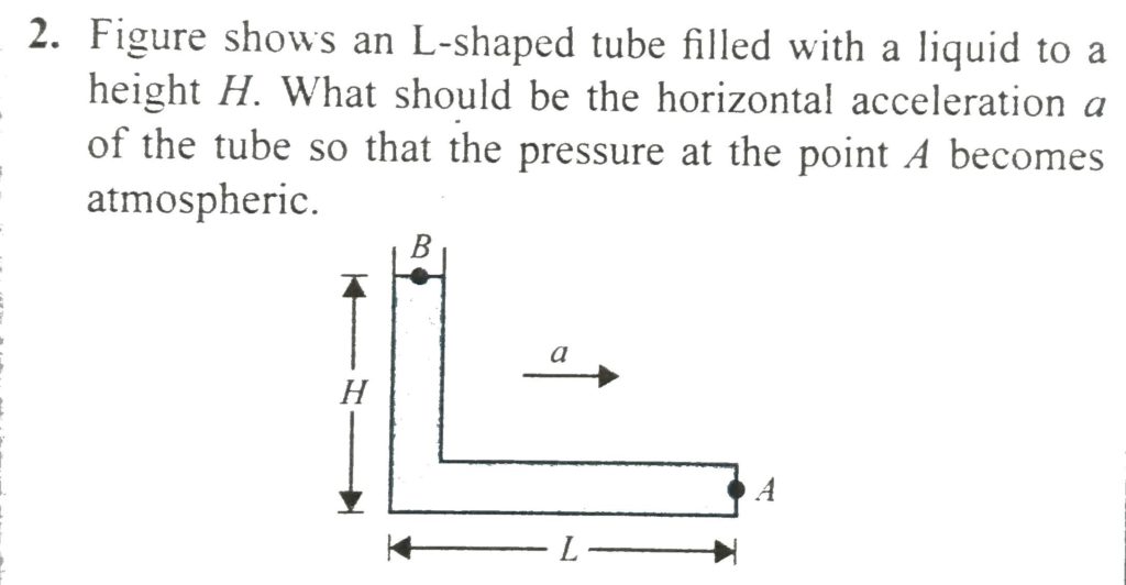 Figure shows an L-shaped tube tilled with a liquid to a height H. What should be the horizontal acceleration a of the tube so that the pressure at the point A becomes atmospheric. Figure shows an L-shaped tube tilled with a liquid to a height H. What should be the horizontal acceleration a of the tube so that the pressure at the point A becomes atmospheric. October 6, 2020 Category: Uncategorised (JEE Advanced Physics by BM Sharma + GMP Solutions) , Facebook Messenger WhatsApp Share this:TwitterFacebook Related