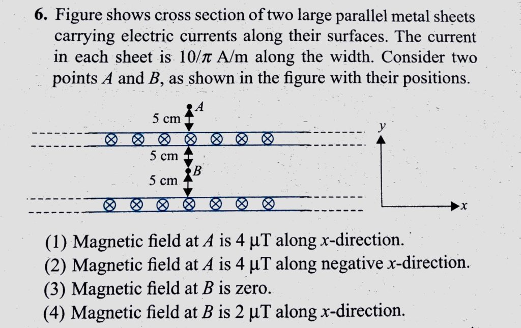 Figure shows cross section of two large parallel metal sheets carrying electric currents along their surface. The current in each sheet is 10/πA/m along the width, Consider two points A and B, as shown in the figure with their positions. as shown in the figure with their positions. Consider two points A and B Figure shows cross section of two large parallel metal sheets carrying electric currents along their surface. The current in each sheet is 10/πA/m along the width October 17, 2020 Category: Uncategorised (JEE Advanced Physics by BM Sharma + GMP Solutions) , Facebook Messenger WhatsApp Share this:TwitterFacebook Related