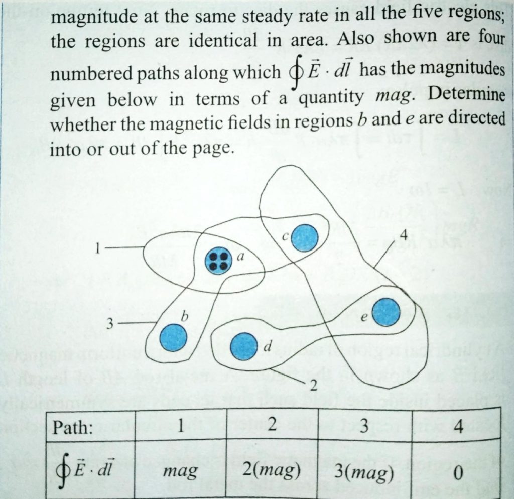 Figure shows five lettered regions in which a uniform magnetic field extends directly either out of the page (as in region a) or into he page. The field is increasing in magnitude at the same steady rate in all five regions, the regions are identical in area. Also shows are four numbered paths along which ∮E .dl has the magnitudes given below in terms of a quantity mag. Determine whether the magnetic fields in regions b through e are directed into ot out of the page.
