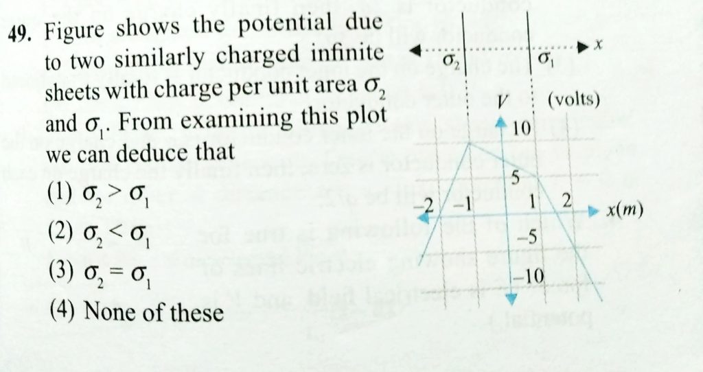 Figure shows the potential due to two similary charged infinite sheets with charge per unit area sigma2 and sigma1. From examining this plot we can deduce that Figure shows the potential due to two similary charged infinite sheets with charge per unit area sigma2 and sigma1. From examining this plot we can deduce that November 6, 2020 Category: Uncategorised (JEE Advanced Physics by BM Sharma + GMP Solutions) , Facebook Messenger WhatsApp Share this:TwitterFacebook Related