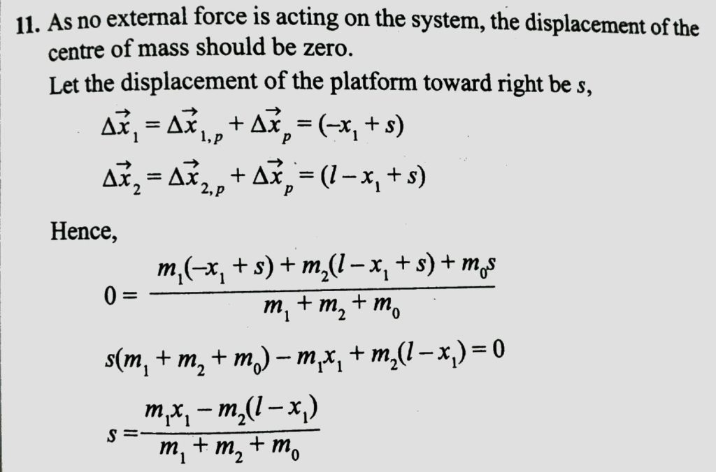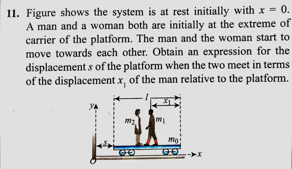 Figure shows the system is at rest initially with x = 0, A man and a woman both are initially at the extreme carrier of the platform. The man and the woman start to move towards each other. Obtain an expression for the displacement s of the platform when the two meet in terms of the displacement x1 of the man relative to the platform. `