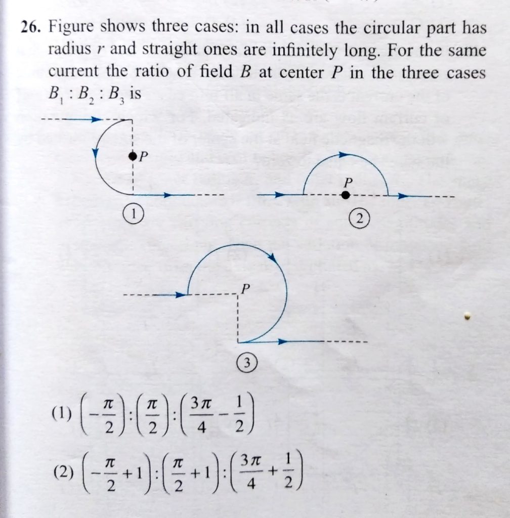 Figure shows three cases: in all cases the circular part has radius r and straight one are infinetly long. For the same current the ratio of field B at centre P in the three cases B1 ; B2 : B3 is Figure shows three cases: in all cases the circular part has radius r and straight one are infinetly long. For the same current the ratio of field B at centre P in the three cases B1 ; B2 : B3 is October 17, 2020 Category: Uncategorised (JEE Advanced Physics by BM Sharma + GMP Solutions) , Facebook Messenger WhatsApp Share this:TwitterFacebook Related