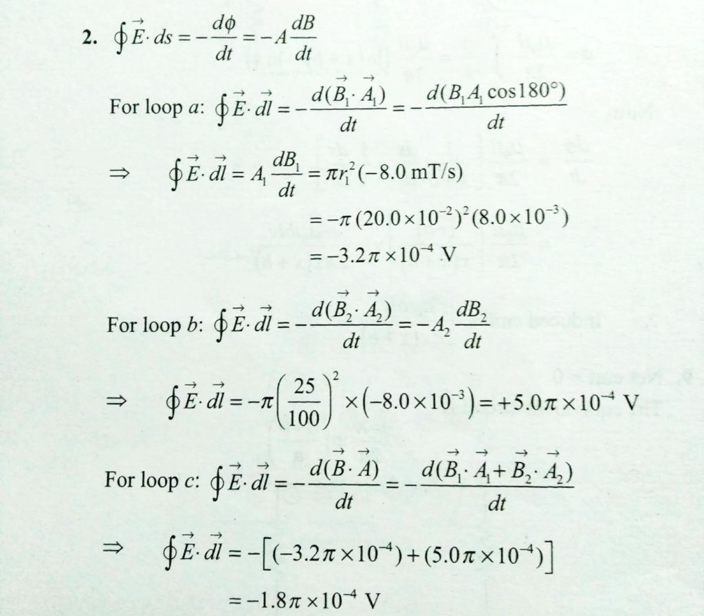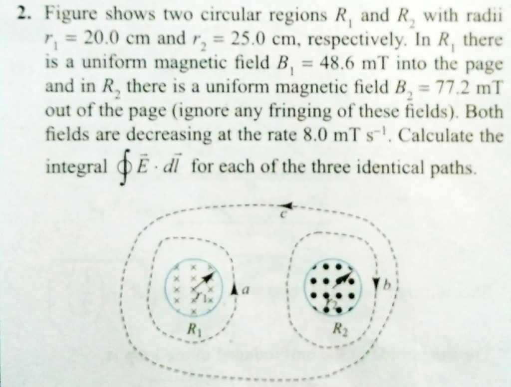 Figure shows two circular regions R1 and R2 with redii r1 = 21.2 cm and r2 = 32.3 cm, respectively. In R1 there is a uniform magetic field B1=48.6mT into the page and in R2 there is a uniform magnetic field B2=77.2mT out of the page (ignore any fringing of these fields).Both fields are decreasing at the rate 8.50 mT/s. Calculate the intergal ∮E .dl for each of the three identical paths.