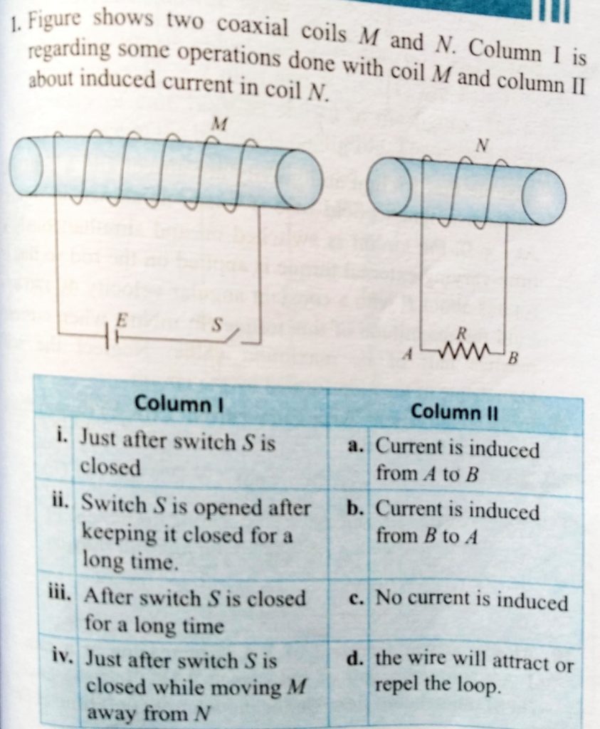 Figure shows two coaxial coils M and N. Column I is regarding some operations done with coil M and column II about induced current in coil N. Figure shows two coaxial coils M and N. Column I is regarding some operations done with coil M and column II about induced current in coil N. October 24, 2020 Category: Uncategorised (JEE Advanced Physics by BM Sharma + GMP Solutions) , Facebook Messenger WhatsApp Share this:TwitterFacebook Related