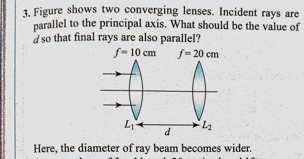 Figure shows two converging lenses. Incident rays are parallel to the principal axis. What should be the value of d so that final rays are also parallel? Figure shows two converging lenses. Incident rays are parallel to the principal axis. What should be the value of d so that final rays are also parallel? October 7, 2020 Category: Uncategorised (JEE Advanced Physics by BM Sharma + GMP Solutions) , Facebook Messenger WhatsApp Share this:TwitterFacebook Related