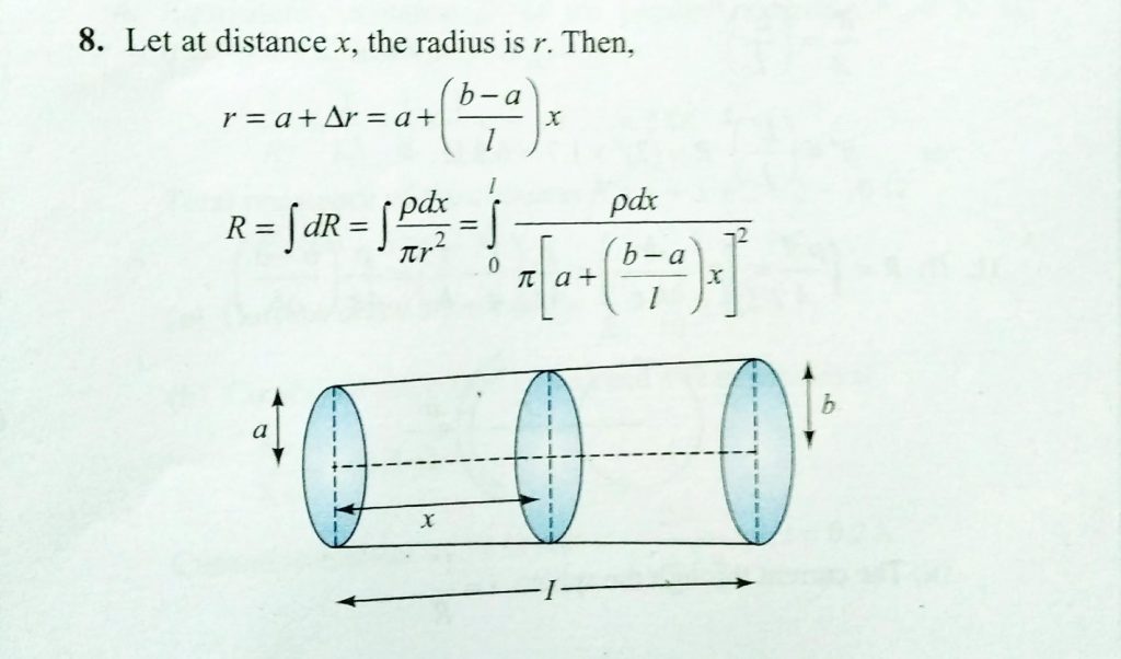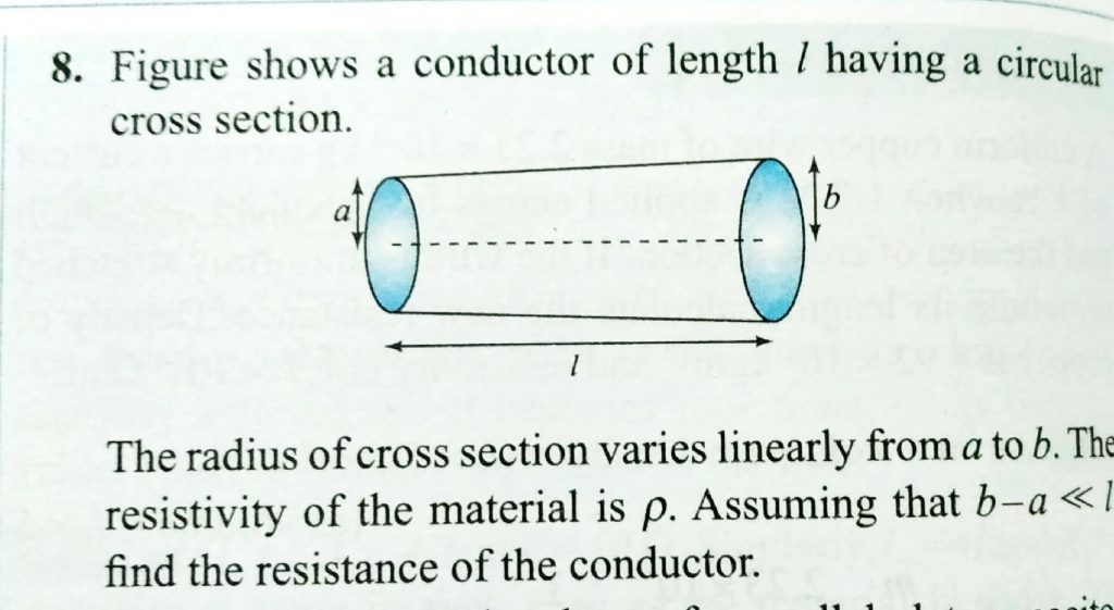 Figure shwos a conductor of length l having a circular cross section . The radius of cross section varies linearly from a to b . The resistivity of the material is rho. Assuming that b-a << l . find the resistance of the conductor. How many electrons per second pass through a section of wire carrying a current of 0.7 A? November 10, 2020 Category: Uncategorised (JEE Advanced Physics by BM Sharma + GMP Solutions) , Facebook Messenger WhatsApp Share this:TwitterFacebook Related