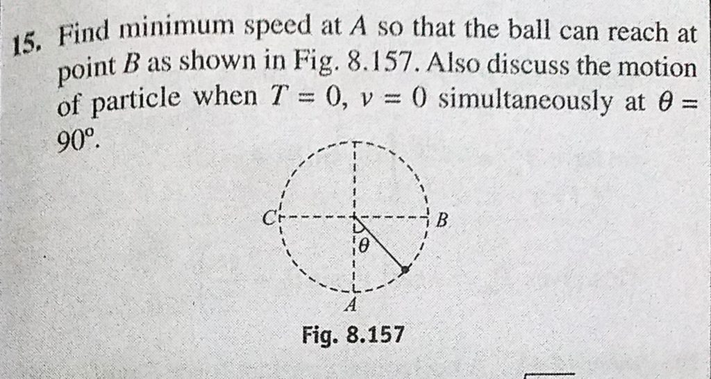 Find minimum speed at A so that the ball can reach at point B as shown in Fig. 8.157. Also discuss the motion of particle when T = 0, v = 0 simultaneously at theta = 90. Find minimum speed at A so that the ball can reach at point B as shown in Fig. 8.157. Also discuss the motion of particle when T = 0 v = 0 simultaneously at theta = 90. October 3, 2020 Category: Uncategorised (JEE Advanced Physics by BM Sharma + GMP Solutions) , Facebook Messenger WhatsApp Share this:TwitterFacebook Related