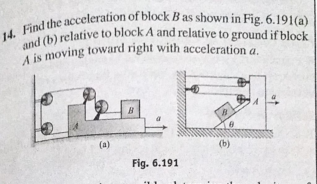 Find the acceleration of block B as shown in Fig. 6.191 (a) and (b) relative to block A and relative to ground if block A is moving toward right with acceleration a. Find the acceleration of block B as shown in Fig. 6.191 (a) and (b) relative to block A and relative to ground if block A is moving toward right with acceleration a. September 28, 2020 Category: Uncategorised (JEE Advanced Physics by BM Sharma + GMP Solutions) , Facebook Messenger WhatsApp Share this:TwitterFacebook Related