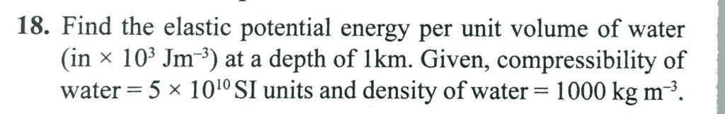 Find the elastic potential energy per unit volume water ( in x 10^3 J/m^3 ) at a depth of 1 km. Given , compressibility of water = 5 x 10^10 SI units and density of water = 1000 kg/m^3. compressibility of water = 5 x 10^10 SI units and density of water = 1000 kg/m^3. Find the elastic potential energy per unit volume water ( in x 10^3 J/m^3 ) at a depth of 1 km. Given October 10, 2020 Category: Uncategorised (JEE Advanced Physics by BM Sharma + GMP Solutions) , Facebook Messenger WhatsApp Share this:TwitterFacebook Related