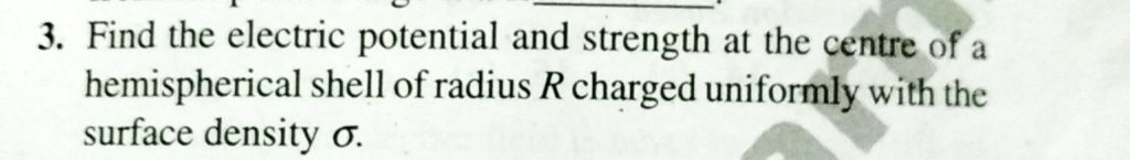 Find the electric potential and strength at the centre of a hemispherical shell of radius R charged uniformly with the surface density sigma. Find the electric potential and strength at the centre of a hemispherical shell of radius R charged uniformly with the surface density sigma. September 18, 2020 Category: Uncategorised (JEE Advanced Physics by BM Sharma + GMP Solutions) , Facebook Messenger WhatsApp Share this:TwitterFacebook Related