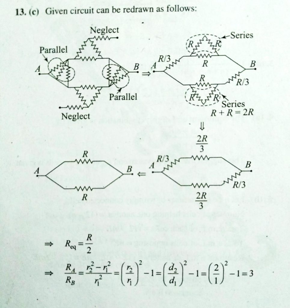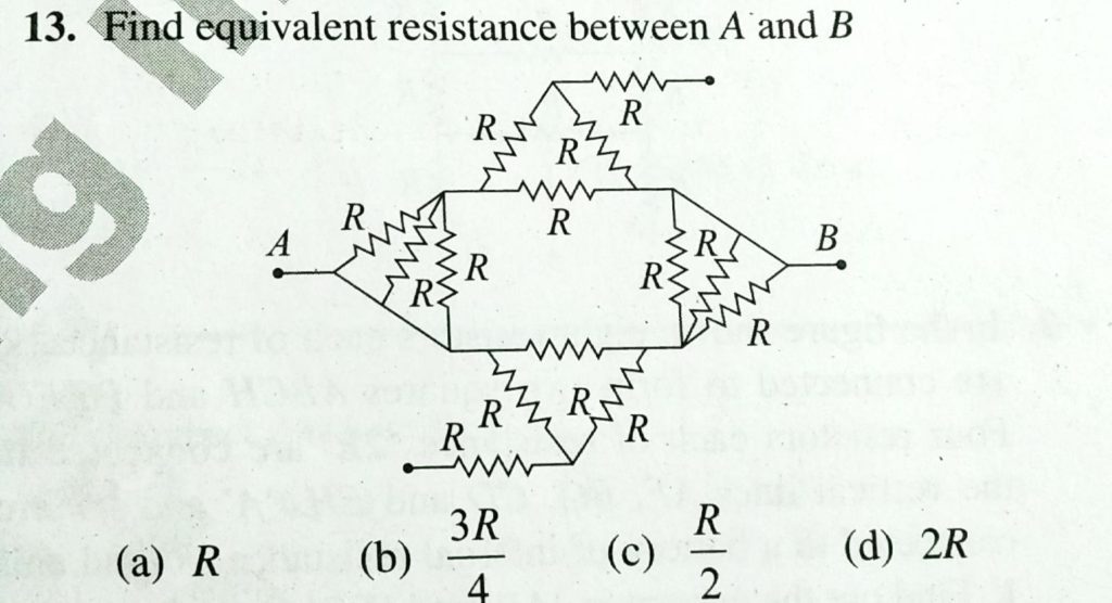 Find the equivalent resistance between A and B a) R b) 3 R/4 c) R/2 d) 2 R Find the equivalent resistance between A and B a) R b) 3 R/4 c) R/2 d) 2 R September 19, 2020 Category: Uncategorised (JEE Advanced Physics by BM Sharma + GMP Solutions) , Facebook Messenger WhatsApp Share this:TwitterFacebook Related