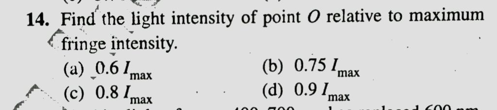 Find the light intensity of point O relative to maximum fringe intensity. Find the light intensity of point O relative to maximum fringe intensity. September 13, 2020 Category: Uncategorised (JEE Advanced Physics by BM Sharma + GMP Solutions) , Facebook Messenger WhatsApp Share this:TwitterFacebook Related