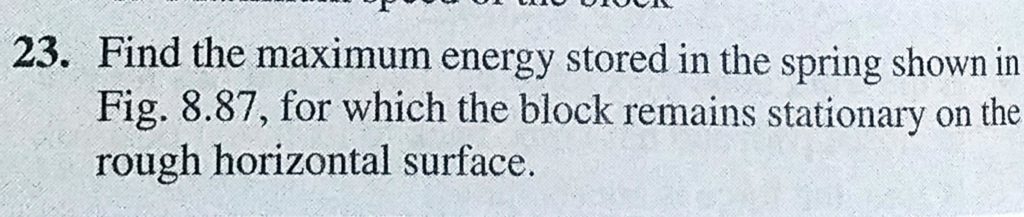 Find the maximum energy stored in the spring shown in Fig. 8.87, for which the block remains stationary on the rough horizontal surface. Find the maximum energy stored in the spring shown in Fig. 8.87 for which the block remains stationary on the rough horizontal surface. October 2, 2020 Category: Uncategorised (JEE Advanced Physics by BM Sharma + GMP Solutions) , Facebook Messenger WhatsApp Share this:TwitterFacebook Related