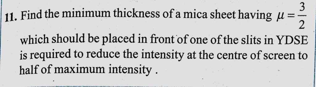 Find the minimum thickness of mica sheet having mu = 3/2 which should be placed in front of one of the slits in YDSE is required to reduce the intensity at the centre of screen Find the minimum thickness of mica sheet having mu = 3/2 which should be placed in front of one of the slits in YDSE is required to reduce the intensity at the centre of screen October 10, 2020 Category: Uncategorised (JEE Advanced Physics by BM Sharma + GMP Solutions) , Facebook Messenger WhatsApp Share this:TwitterFacebook Related