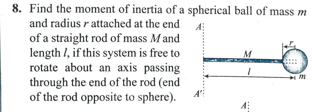Find the moment of inertia A of a spherical ball of mass m and radius r attached at the end of a straight rod of mass M and length l, if this system is free to rotate about an axis passing through the end of the rod (end of the rod opposite to sphere).