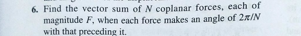 Find the vector sum of N coplanar forces, each of magnitude F, when each force make an angle of 2 pie/N with that preceding it. each of magnitude F Find the vector sum of N coplanar forces when each force make an angle of 2 pie/N with that preceding it. September 17, 2020 Category: Uncategorised (JEE Advanced Physics by BM Sharma + GMP Solutions) , Facebook Messenger WhatsApp Share this:TwitterFacebook Related