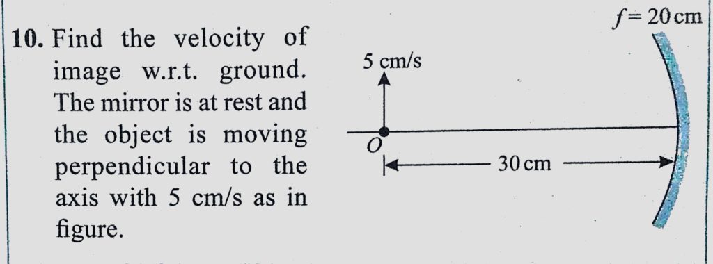 Find the velocity of image w.r.t. ground. The mirror is at rest and the object is moving perpendicular to the axis with 5 cm/s as in figure. Find the velocity of image w.r.t. ground. The mirror is at rest and the object is moving perpendicular to the axis with 5 cm/s as in figure. October 5, 2020 Category: Uncategorised (JEE Advanced Physics by BM Sharma + GMP Solutions) , Facebook Messenger WhatsApp Share this:TwitterFacebook Related